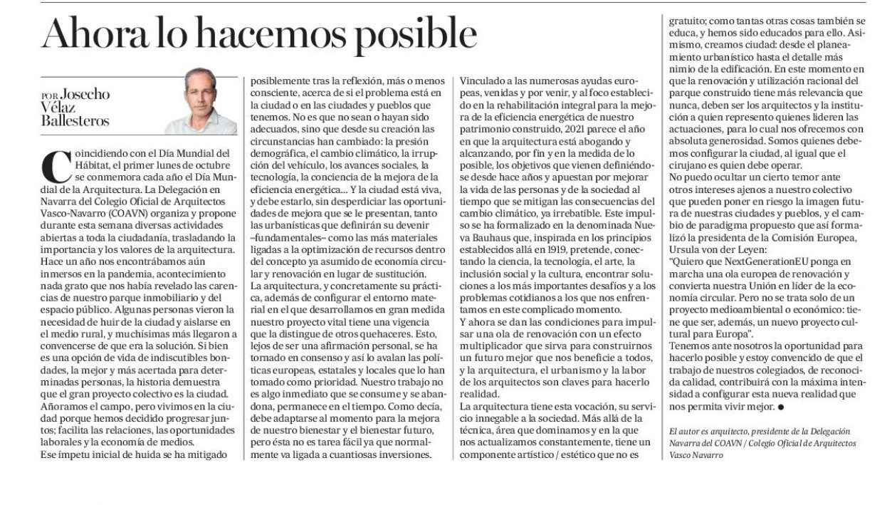 Día Mundial de la Arquitectura: Ahora lo hacemos posible En los medios Mirar la Arquitectura4 de octubre de 2021 DIARIO DE NOTICIAS DE NAVARRA edición digital Compartir Twitter0 Facebook0 Google +0 Linkedinactive){li-icon[type=linkedin-bug][color=inverse] .background{fill Enviar por email Imprimir este artículo Autor COAVNA