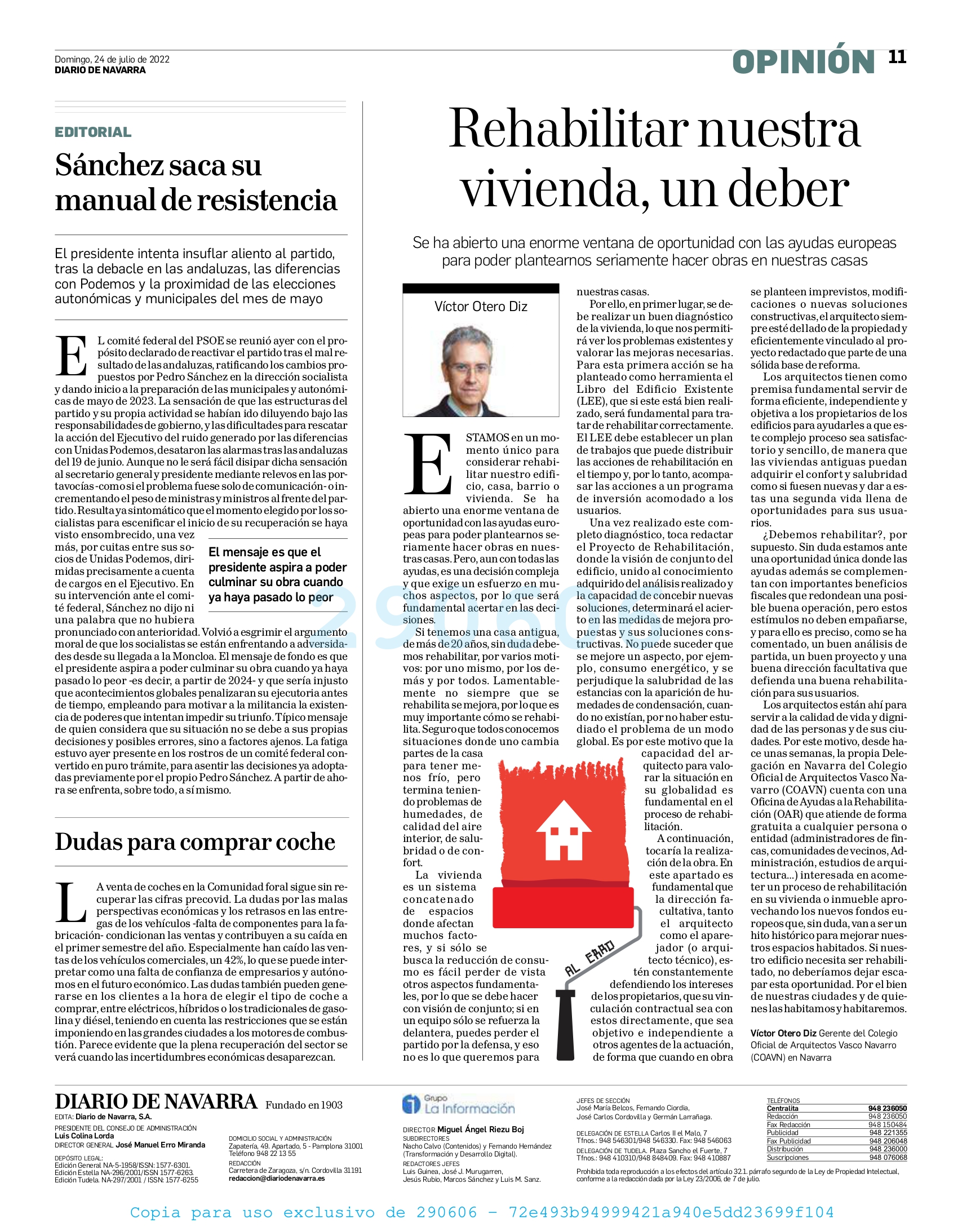 Rehabilitar nuestra vivienda, un deber / Por Víctor Otero Diz, gerente del COAVN en Navarra En los medios24 de julio de 2022 DIARIO DE NAVARRA edición digital Compartir Twitter0 Facebook0 Google +0 Linkedinactive){li-icon[type=linkedin-bug][color=inverse] .background{fill Enviar por email Imprimir este artículo Autor COAVNA