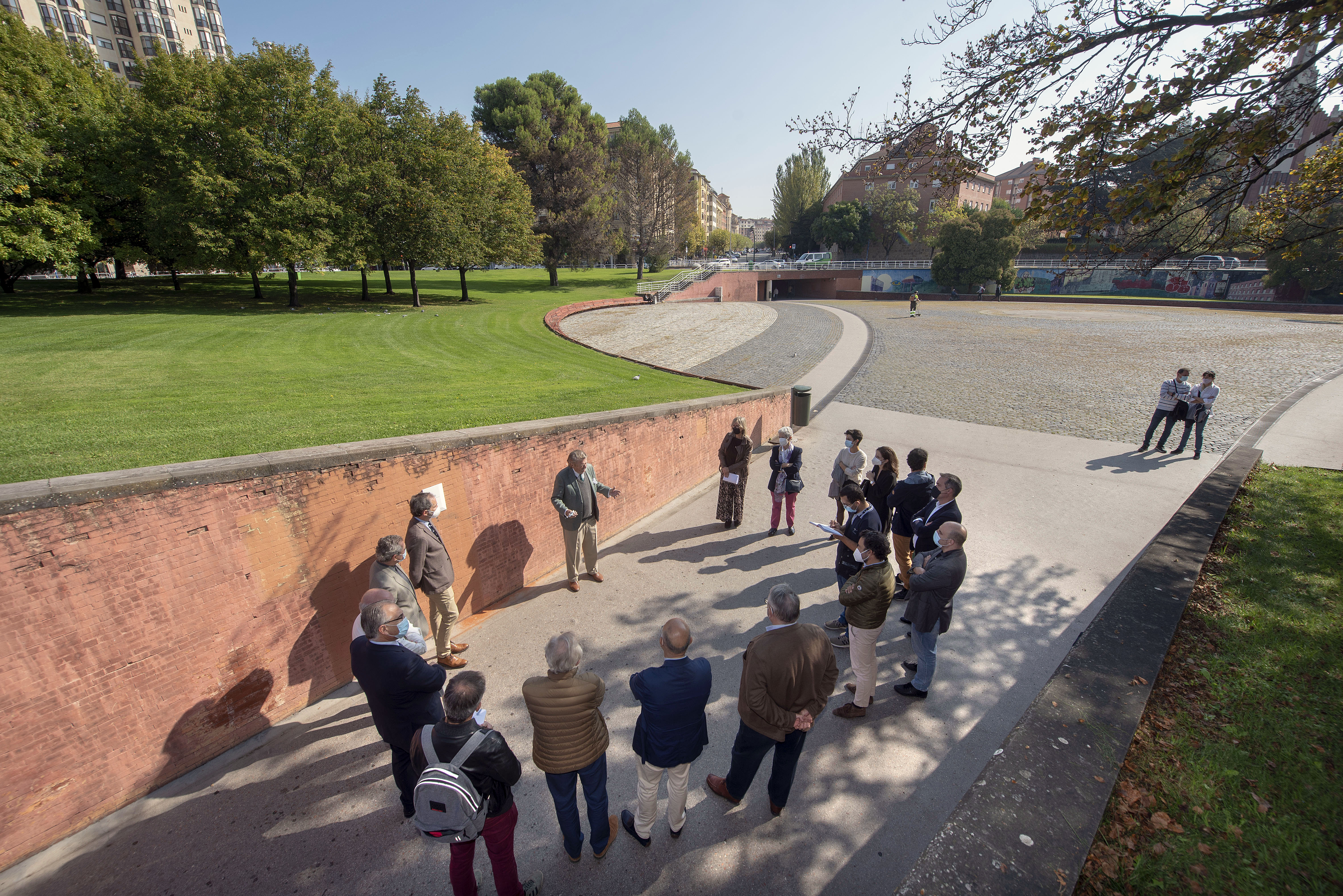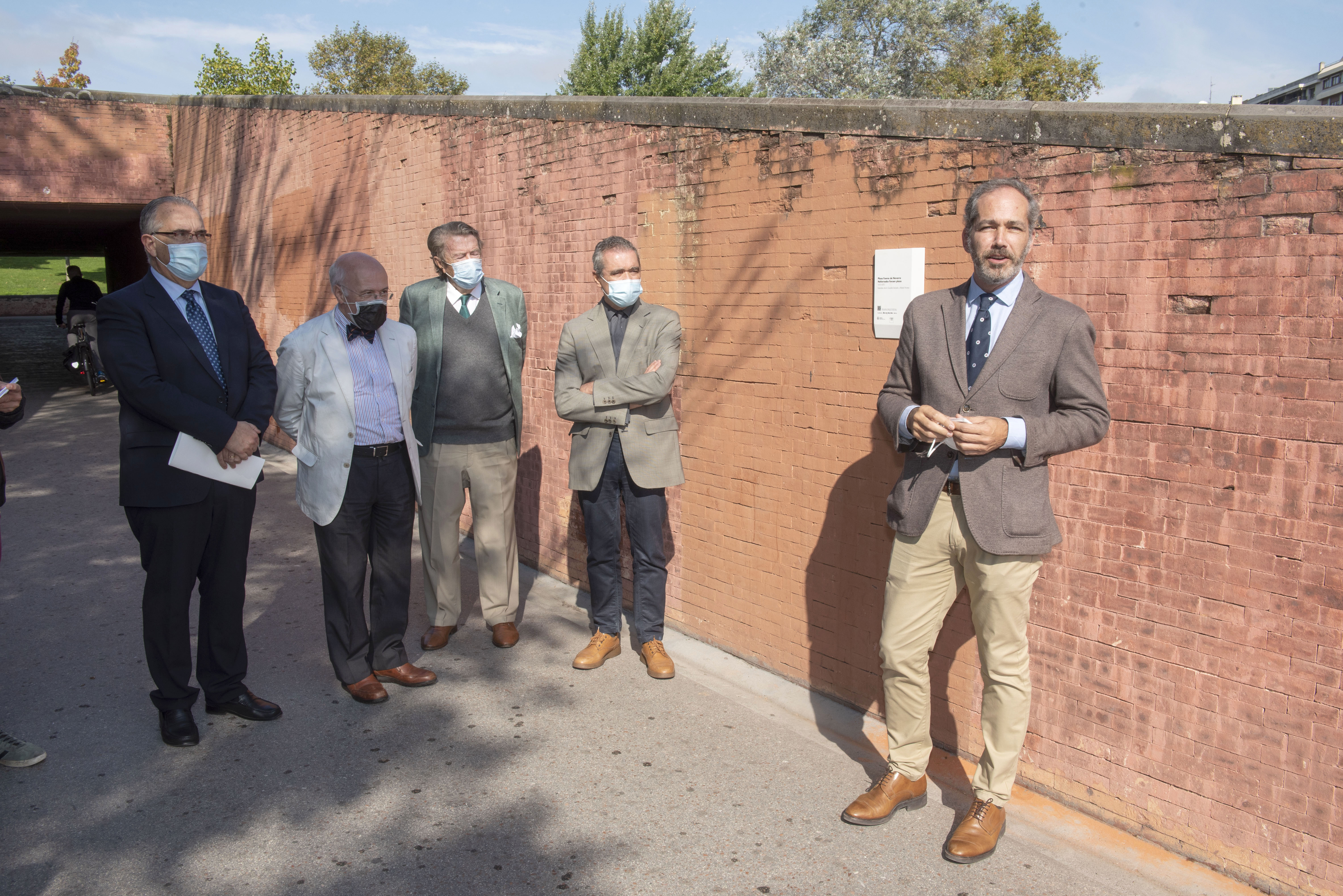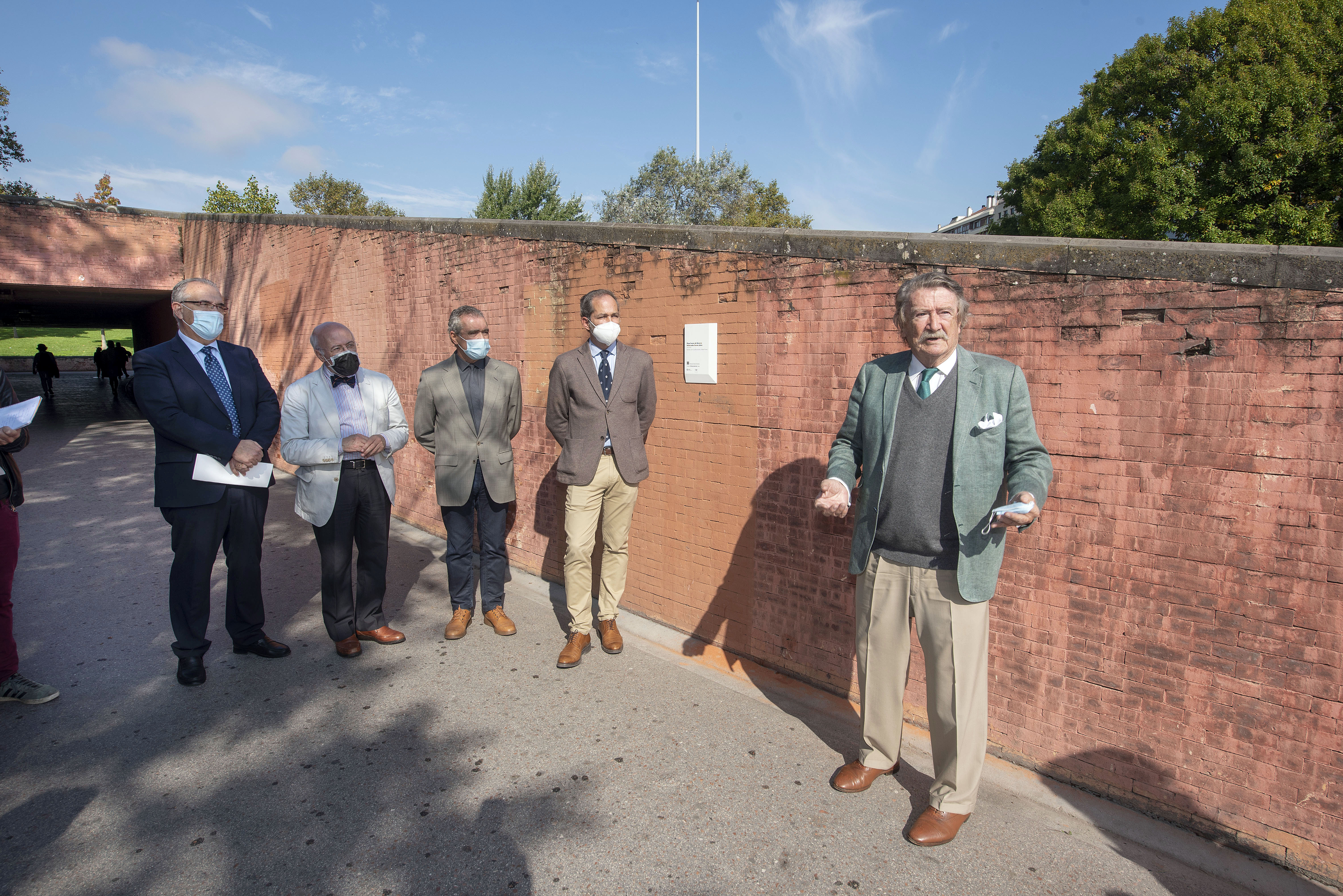 COAVN 389537Una mañana soleada que reunió a una veintena de personas, la inmensa mayoría arquitectos, en torno a ese punto de la plaza, para rendir homenaje a una obra arquitectónica de la ciudad construida en 1975, y por lo tanto, perteneciente al Movimiento Moderno, la única plaza entre los 30 edificios navarros que incluye el DoCoMoMo Ibérico.