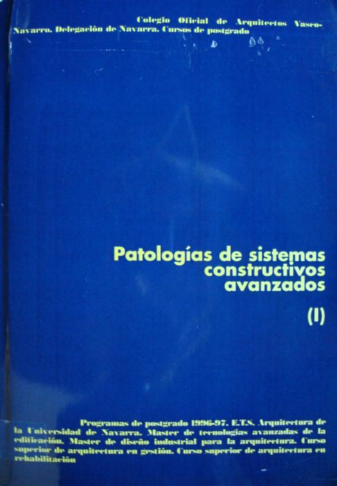SANCHEZ-OSTIZ GUTIERREZ, Ana. Patologías de sistemas constructivos avanzados : programas de postgrado1996-1997 . V. 1 / directoras del curso, Ana Sánchez-Ostiz Gutiérrez,Enrique Maya Miranda. — Pamplona : COAVN, Delegación de Navarra : ETSAUN, 1997. — 298 p. (pag. var.) ; 24 cm