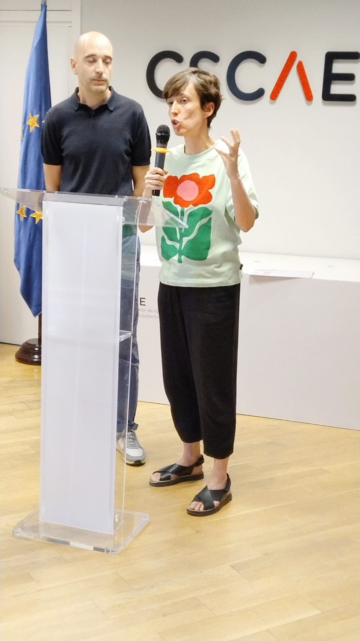 En las imágenes inferiores, Maier Vélez y David Serrano acompañados por la presidenta del CSCAE , Marta Vall-llossera Ferran, y por el Decano del COAVN, Patxi Chocarro, tras la entrega del premio en la sede del CSCAE, en Madrid / En la segunda imagen, la presidenta del CSCAE y presidenta del jurado de este concurso leyendo el acta del mismo / Tercera imagen, Maier Vélez explicando el contenido del proyecto ganador.