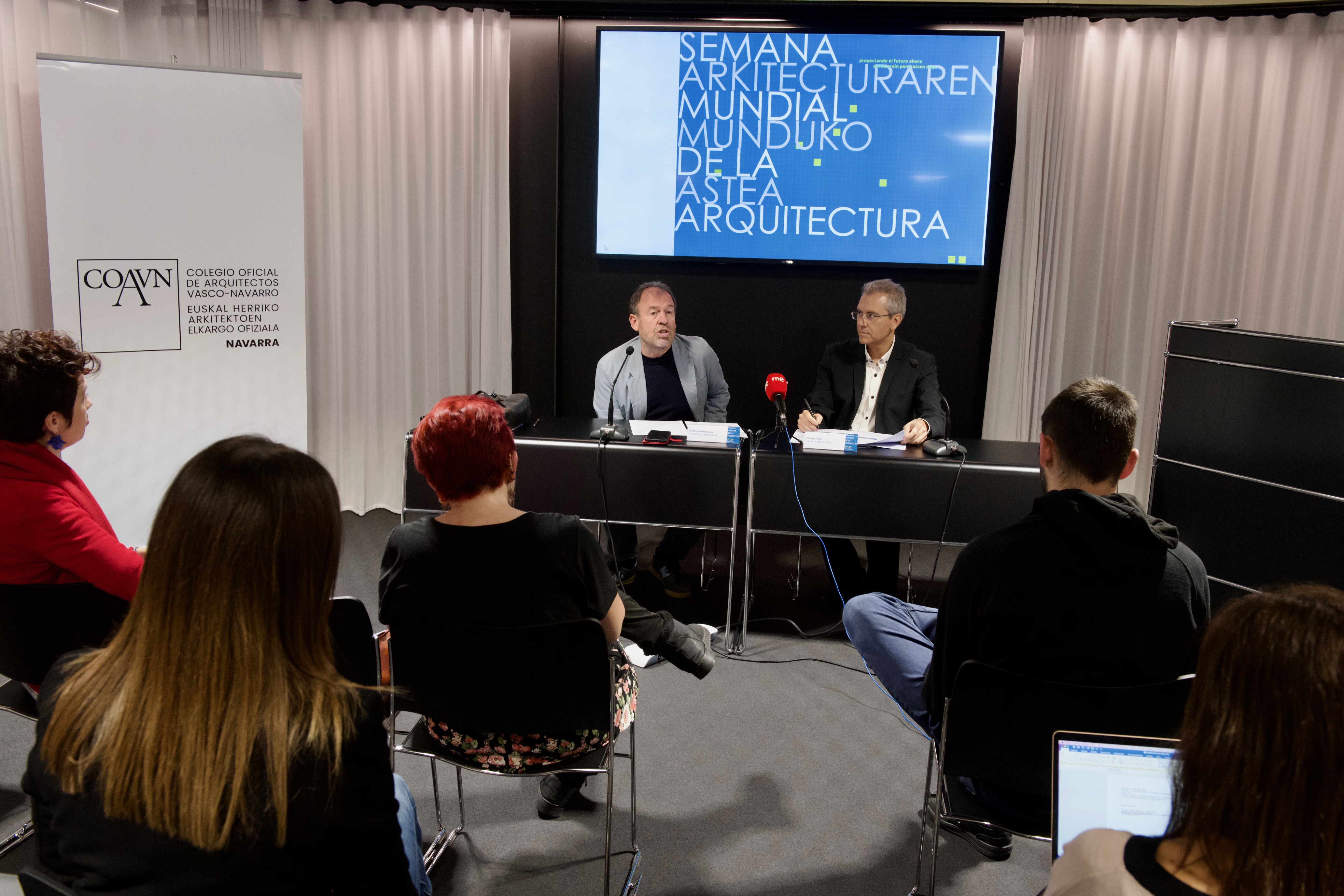 Santiago Iribarren y Víctor Otero, Presidente y gerente del COAVN respectivamte, presentaron en rueda de prensa las actividades que se van a llevar a cabo en Navarra con motivo del Día y la Semana Mundial de la Arquitectura 2024, que se celebrará del 7 al 11 de octubre en Pamplona. La noticia ha tenido repercusión en los medios locales: Diario de Navarra, Diario de noticias, RNE, Onda cero, Pamplona actual…